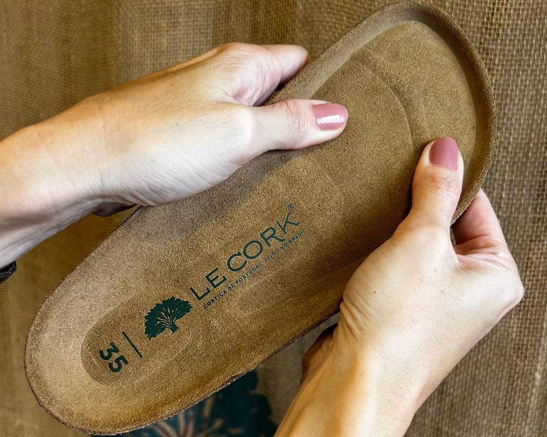 Na Le Cork, a palmilha de cortiça é importada diretamente de Portugal. O sobreiro é uma árvore nativa portuguesa e é dele que se extrai a melhor cortiça do mundo utilizada nos calçados Le Cork. Após o envio da palmilha para o Brasil, o calçado é montado com couro, fivela e sola de EVA aqui no Brasil. Para garantir um conforto ainda maior, todas as palmilhas contam com um sistema de amortecimento na palmilha que garante uma maciez já no primeiro calçar.